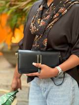 It's a premium smooth leather shoulder bag paired with refined gold-tone hardware for a luxurious finish. The front flap is secured with a modern decorative buckle accent. Adjustable shoulder strap for customizable comfort and dual compartments to keep your essentials neatly organized.
